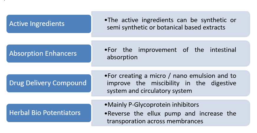 It is known that the delivery of these phyto cannabinoids is significantly influenced by their physicochemical properties, such as water solubility, partition coefficient, lipophilicity and crystallinity and so on. It is been reported that, the oral bioavailability of cannabinoids range from 13-19% and inhalation bioavailability is between 11-45% (mean 31%). To have higher bio availability, it is better to be formulated into a highly bioavailable compound using bioavailability enhancers. A major obstacle in the development of cannabinoid-based drug has been the lower water solubility which makes it difficult to develop effective formulation for human use.
