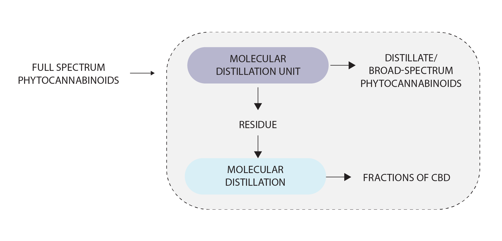 The resultant product can be further distilled to get THC-remediated, broad-spectrum product. Various fractions of the broad-spectrum phytocannabinoids can also be isolated using the molecular distillation system by adopting different standard operating procedures.