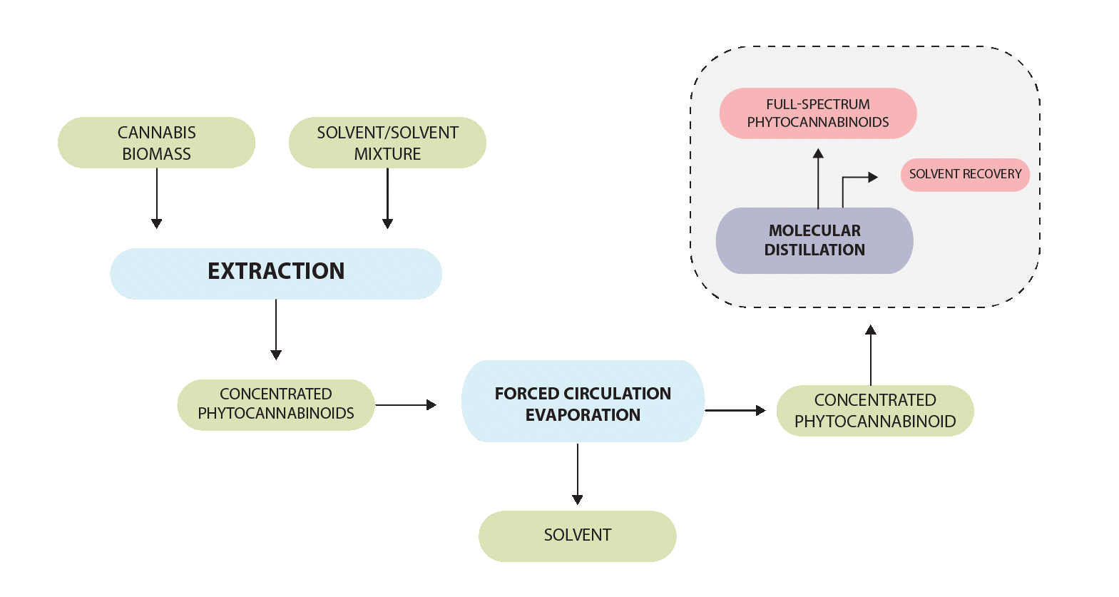 The miscella (oil and solvent) after the extraction of phytocannabinoids from solid-liquid extraction methods of dry cannabis biomass or hydrodynamic methods of extraction of phytocannabinoids from fresh cannabis biomass must be distilled and concentrated (solvent recovery), to get a solvent-free, highly concentrated full-spectrum extract. Also, the full-spectrum phytocannabinoids can be subjected to distillation to remove much of the tetrahydrocannabinol (THC) and produce a broad-spectrum distillate.